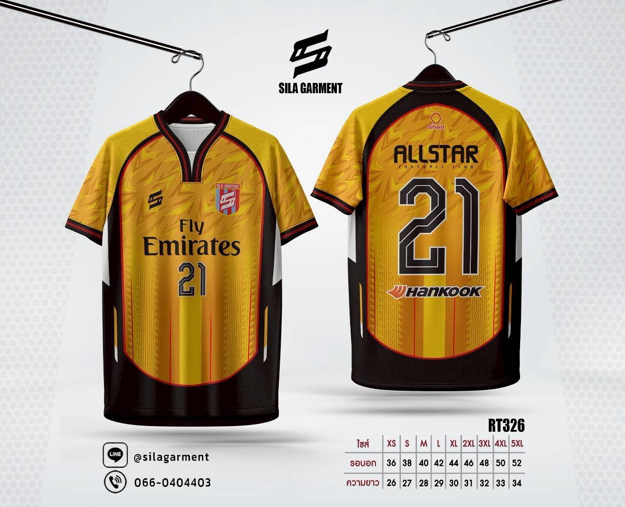 เสื้อกีฬา RT326 ลายทองส้มสุดเท่ห์ ดีไザน์ Emirates ออลสตาร์ เบอร์21 ผ้าโพลีเอสเตอร์ระบายอากาศ พิมพ์ Sublimation คมชัด ไม่หลุดลอก ขนาดครบ XS-5XL