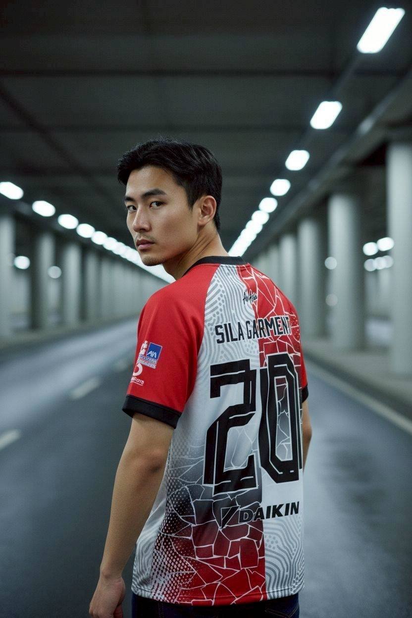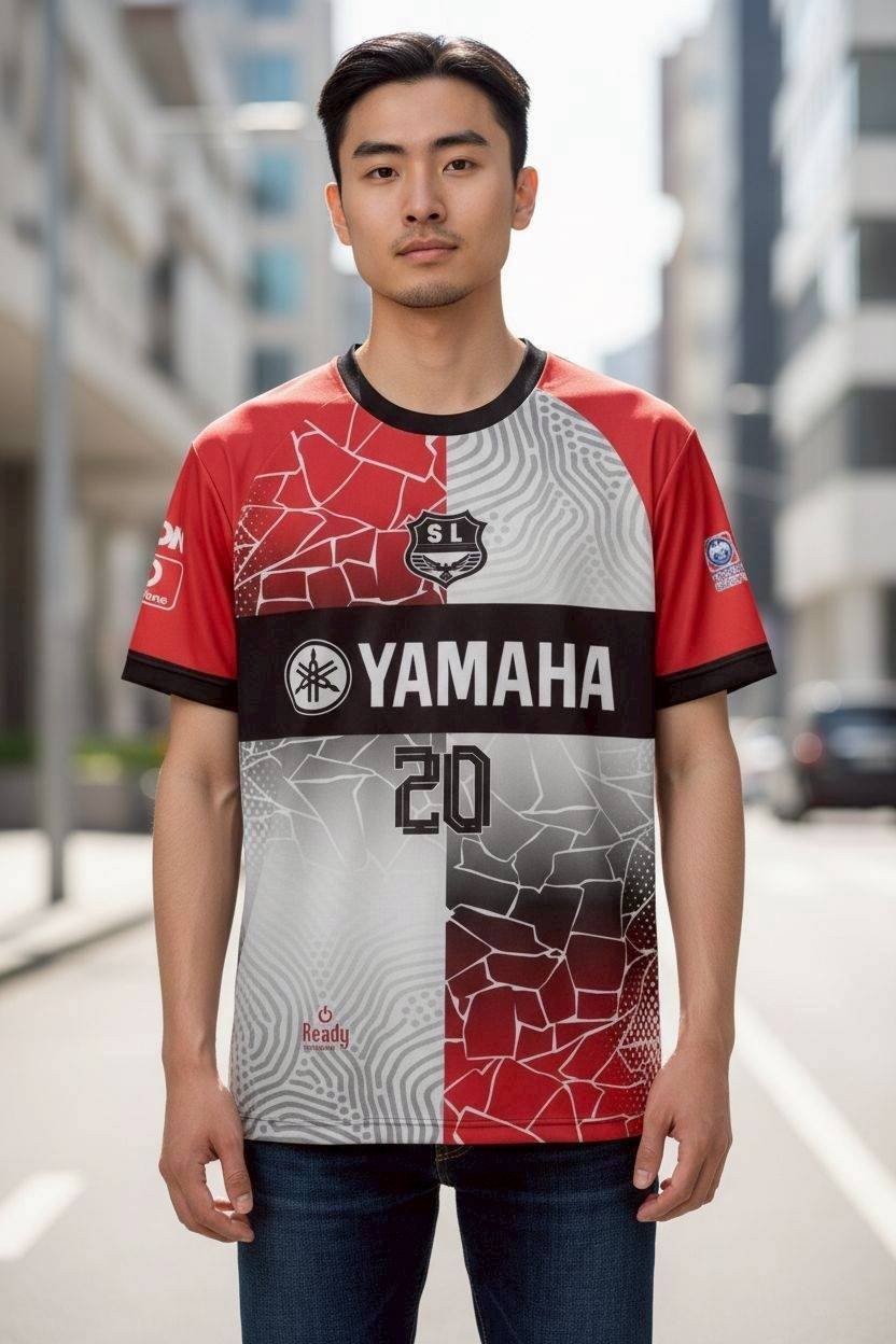 เสื้อกีฬาสุดเท่ห์ด้วยลวดลายเรขาคณิตแบบ Geometric Pattern ที่ผสมผสานสีแดง ขาว และดำอย่างลงตัว พร้อมโลโก้ YAMAHA โดดเด่น และหมายเลข 20 ที่ออกแบบมาเป็นพิเศษ