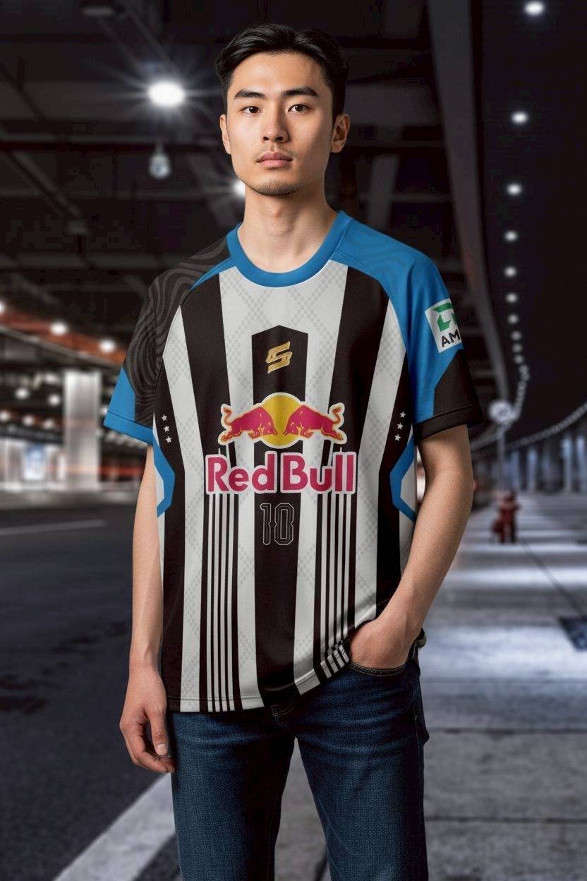 เสื้อกีฬาสุดเท่ห์ดีไซน์เฉพาะ ลายทางดำขาวคลาสสิคผสมผสานกับโลโก้ Red Bull และ Honda อย่างลงตัว พร้อมหมายเลข 10 สไตล์นักแข่งมืออาชีพ ดีเทลสีฟ้าและดำเพิ่มความโดดเด่น