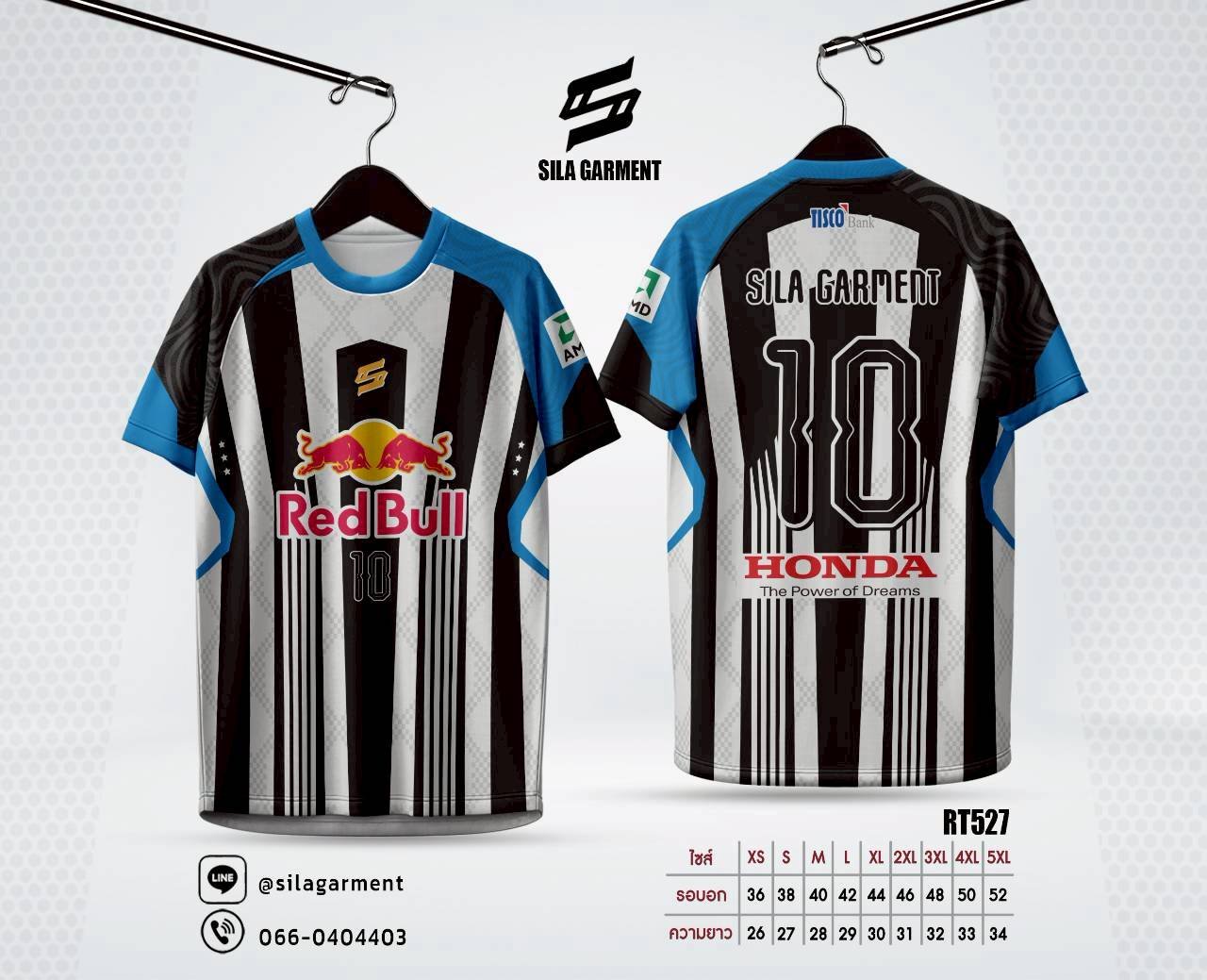 เสื้อกีฬา RT527 ดีไซน์สไตล์เรซซิ่ง Red Bull Honda ลายทางดำขาวเท่ห์ สกรีนด้วยเทคนิค Sublimation คุณภาพสูง ผ้าโพลีเอสเตอร์ระบายอากาศดี ไซส์ XS-5XL พร้อมส่ง