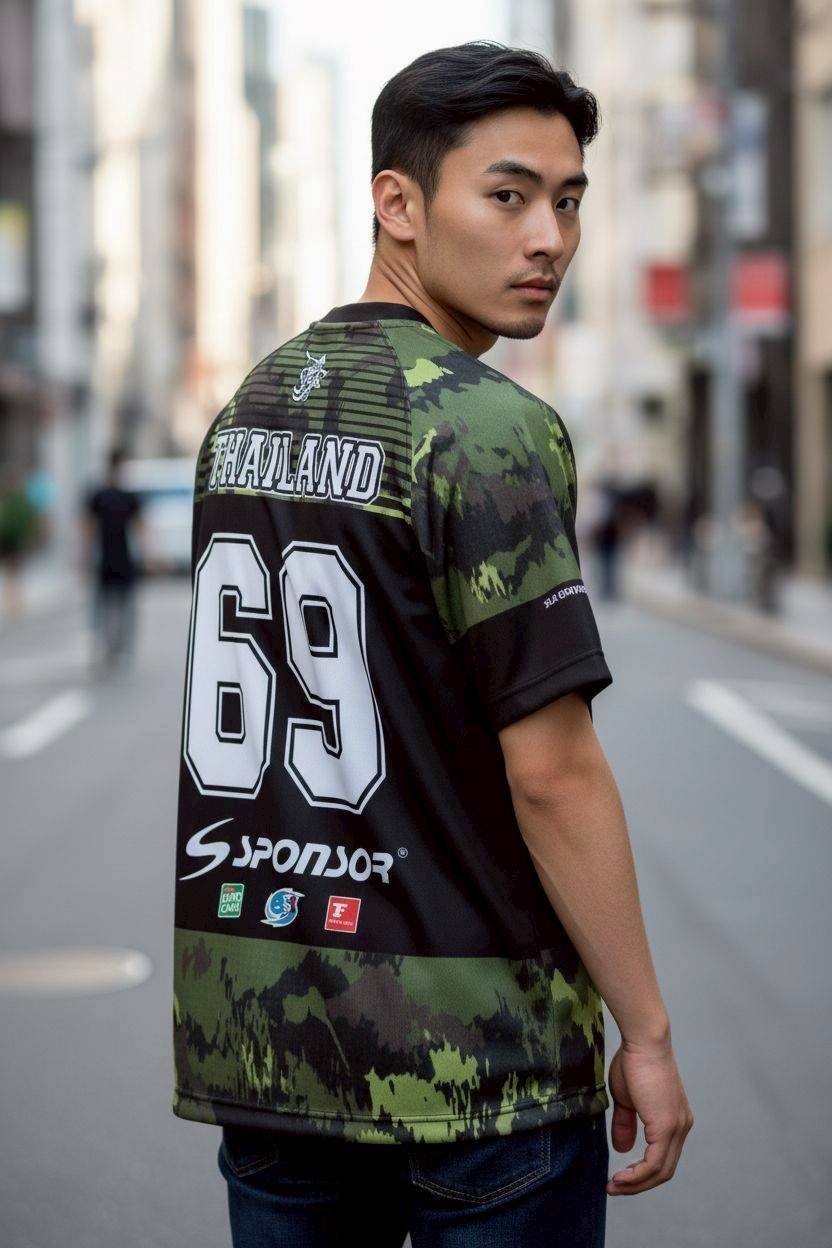 เสื้อกีฬาดีไザน์เฉพาะสไตล์ทหาร ลายพรางสีเขียวสุดเท่ พร้อมโลโก้ทีมไทยแลนด์และหมายเลข 69 โดดเด่นด้วยแบรนด์ SANYO SPONSOR บนเสื้อ