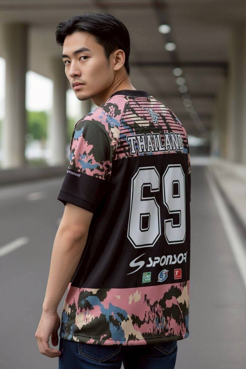 เสื้อกีฬาสไตล์สตรีทแฟชั่นสุดเท่ ดีไザน์ลายทหารโทนสีชมพู-เขียว-ดำ ผสมผสานความคลาสสิกกับความทันสมัย พร้อมโลโก้ SANYO และ THAILAND หมายเลข 69 ที่โดดเด่น