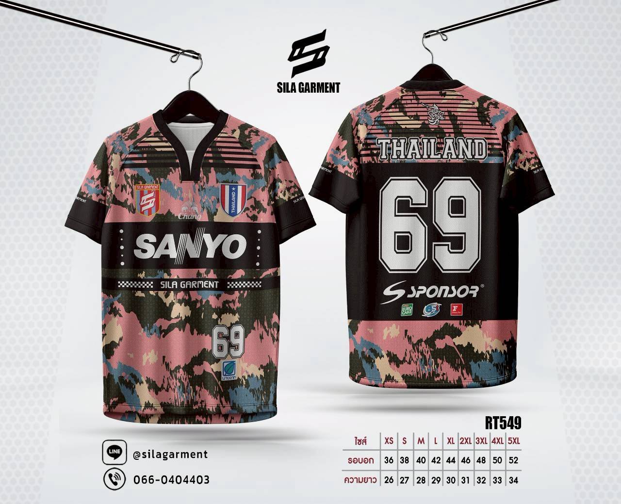 เสื้อกีฬาสไตล์สตรีทแฟชั่น ลายพรางทหารโทนสีชมพูสุดชิค ดีไซน์ SANYO THAILAND หมายเลข 69 ผลิตจากผ้าโพลีเอสเตอร์ระบายอากาศ พิมพ์เทคนิค Sublimation คุณภาพพรีเมียม ใส่ได้ทั้งเล่นกีฬาและลุคแคชชวล