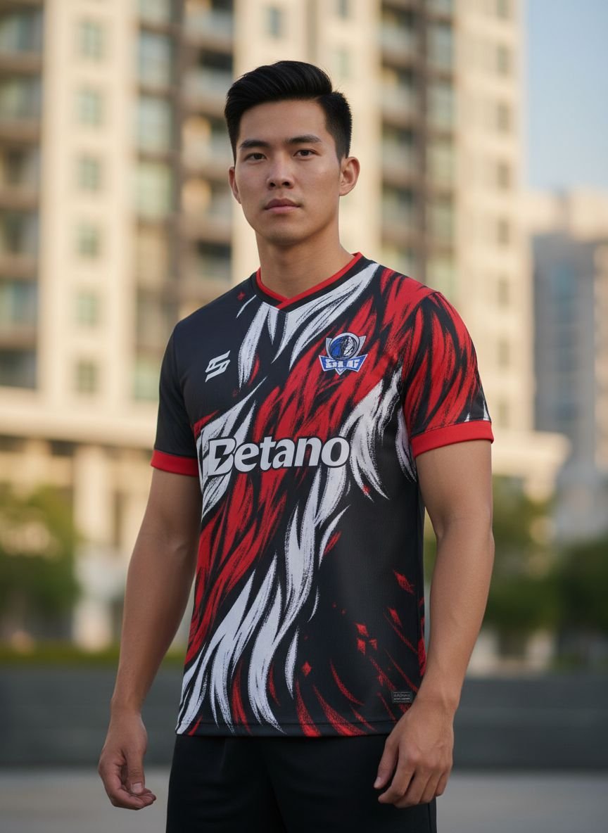 เสื้อกีฬาดีไซน์เซาดี ลายเผ่าพื้นเมืองแดงดำทอง โดดเด่นสวยงาม ผ้าโพลีเอสเตอร์ระบายอากาศ เทคนิค Sublimation ไม่ลอกไม่ซีด รองรับสั่งทำตามแบบ