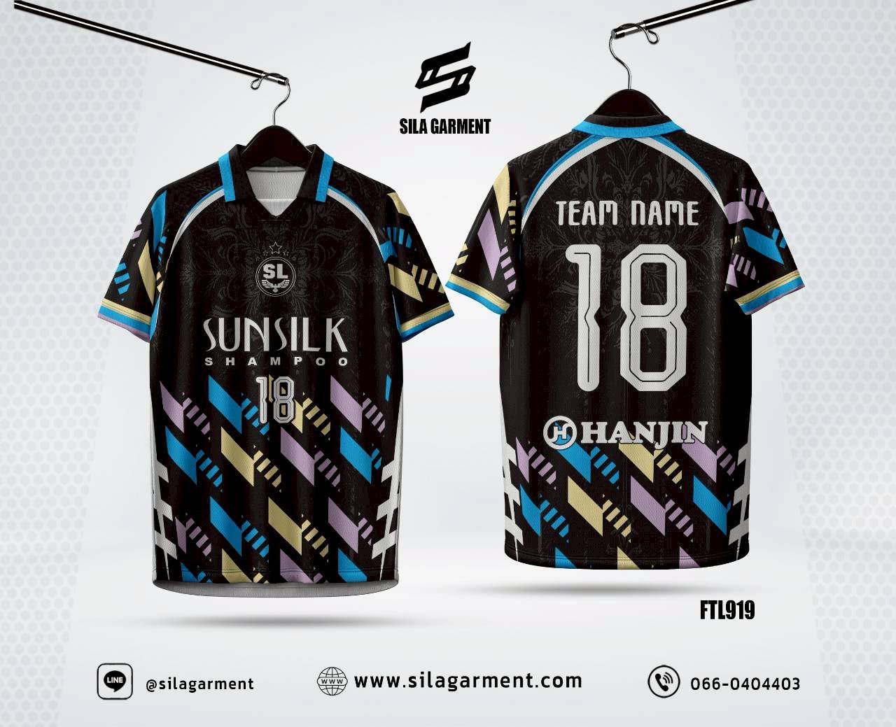 เสื้อกีฬาสีดำโดดเด่นด้วยลายกราฟิกเรขาคณิตสีสันสดใส ผสมผสานโทนสีฟ้า ม่วง และทอง สร้างความเป็นเอกลักษณ์ให้กับทีมของคุณ