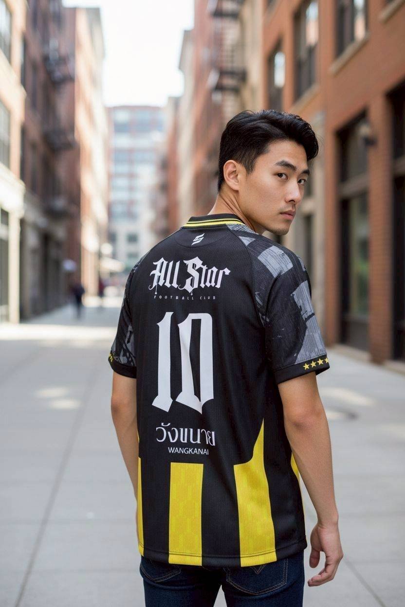 เสื้อฟุตบอลสไตล์โปรลีก All Star Kinnarps เบอร์ 10 ลายทางเหลือง-ดำสุดเท่ห์ แขนลายตารางเทาโมเดิร์น ผ้าโพลีเอสเตอร์ระบายอากาศ พิمพ์ Sublimation คุณภาพพรีเมียม ไม่ลอก ไม่ซีด ใส่สบาย เหมาะทั้งเล่นกีฬาและแฟชั่น