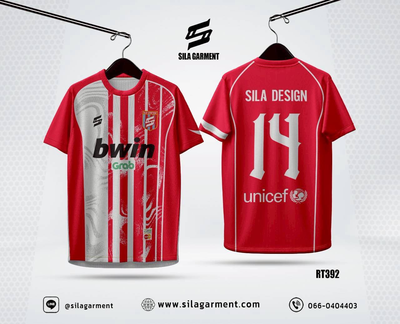 เสื้อฟุตบอล RT392 ลายแนวตั้งสีแดงขาวสไตล์คลาสสิค พร้อมโลโก้ยูนิเซฟ ผลิตจากผ้าโพลีเอสเตอร์ระบายอากาศ เทคนิค Sublimation คุณภาพพรีเมียม ไม่ลอก ไม่ซีด เหมาะสำหรับเล่นกีฬาและใส่ลำลอง