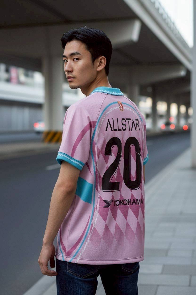 เสื้อฟุตบอลสีชมพูฟ้าลายเพชรสุดโดดเด่น ดีไซน์เฉพาะของทีม Ziggo หมายเลข 20 ALLSTAR พร้อมโลโก้ Yokohama ที่หลังเสื้อ สร้างสรรค์ด้วยแนวคิดวินเทจที่ผสมผสานความทันสมัย