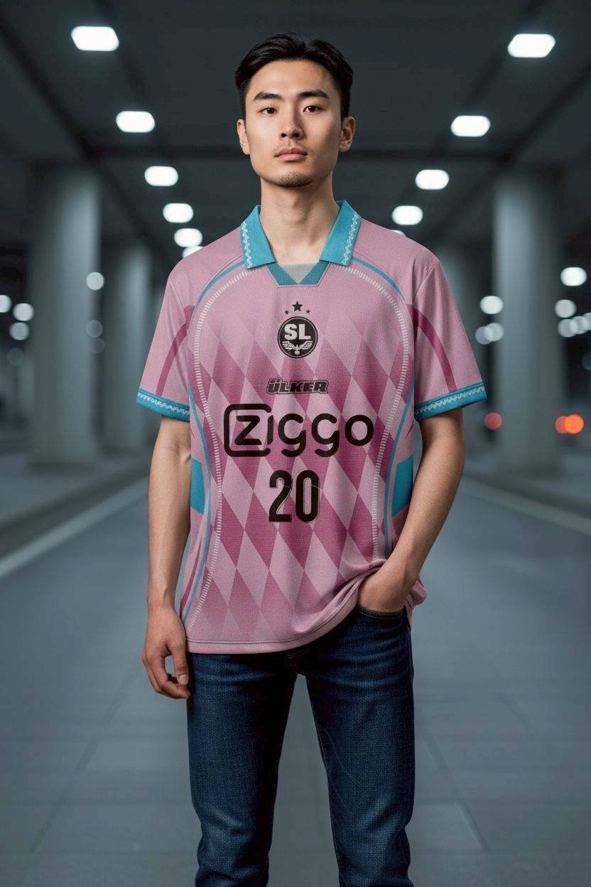เสื้อฟุตบอล RT423 ทีม Ziggo สีชมพูฟ้าลายเพชรสไตล์วินเทจ หมายเลข 20 ALLSTAR พร้อมโลโก้ Yokohama ผลิตจากผ้าโพลีเอสเตอร์ระบายอากาศด้วยเทคนิค Sublimation ให้ความคมชัดและทนทาน เหมาะสำหรับทั้งเล่นกีฬาและแฟชั่นประจำวัน