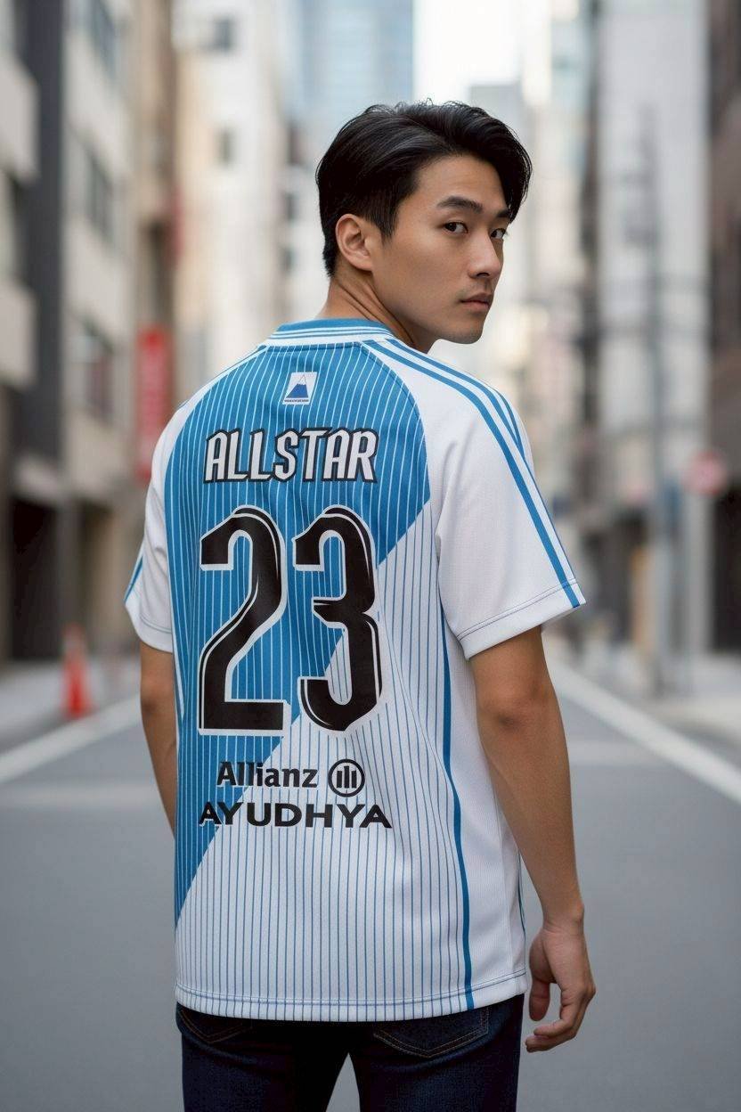 เสื้อฟุตบอลสไตล์วินเทจที่ผสมผสานความคลาสสิกกับความทันสมัย ดีไซน์ลายทางสีฟ้าขาวสลับกับแนวทแยงสุดเท่ ตัวอักษร ALLSTAR 23 เป็นจุดเด่นที่โดดเด่น พร้อมโลโก้ FIAT HITACHI และ SL ที่เพิ่มความเป็นเอกลักษณ์