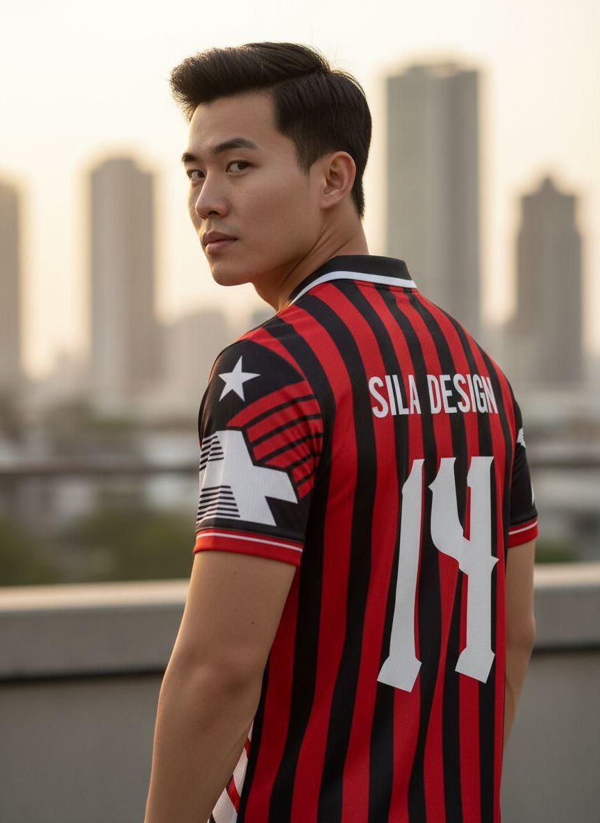 เสื้อฟุตบอลออกแบบพิเศษที่ผสมผสานลายทางคลาสสิกแดง-ดำของมิลานเข้ากับกราฟิกเรขาคณิตสีขาวสุดโมเดิร์น พร้อมเบอร์ 14 และชื่อ SILA DESIGN ที่เด่นชัด