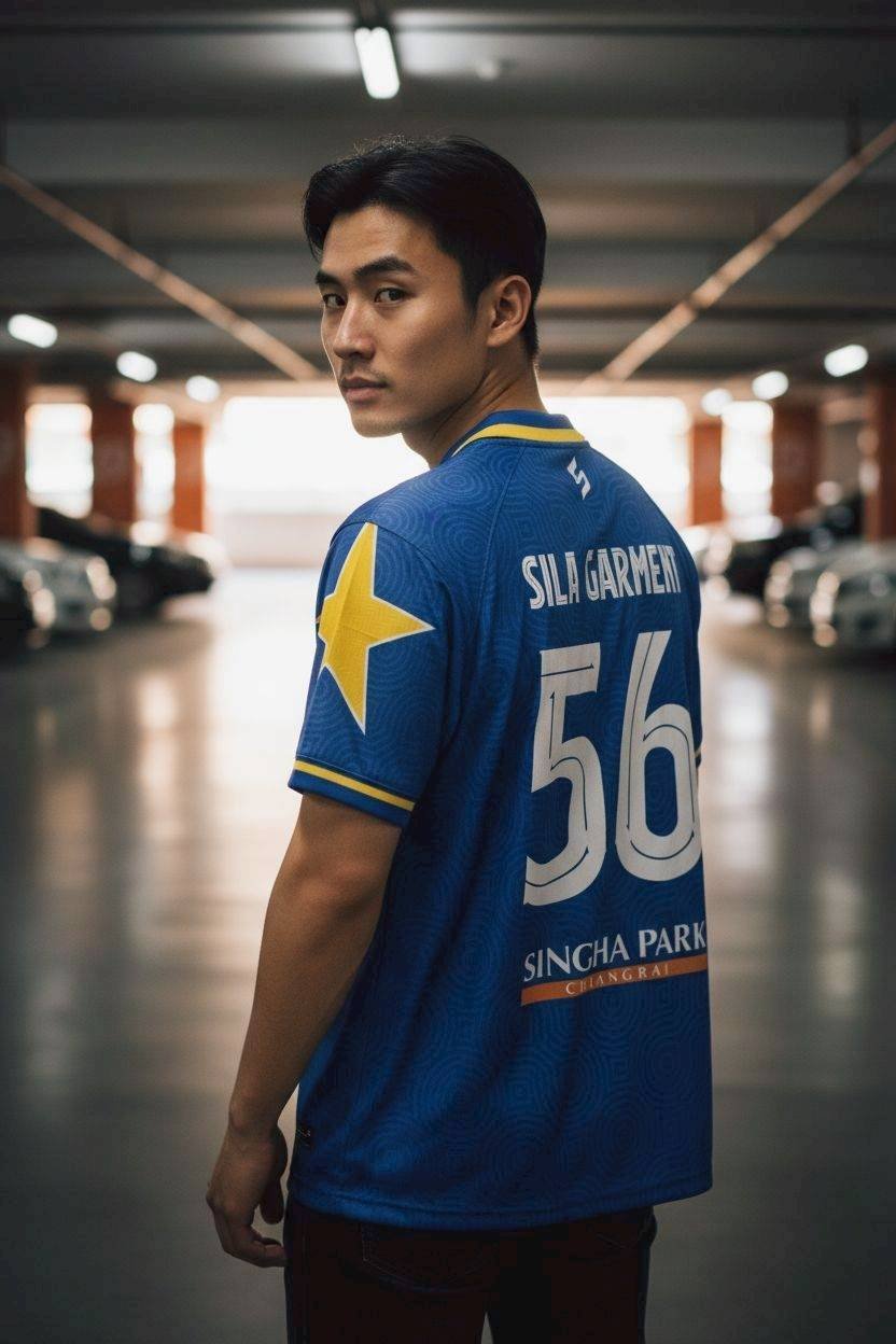 เสื้อฟุตบอลลายวงกลมวินเทจสีน้ำเงินเหลืองที่ได้แรงบันดาลใจจากชุดแข่งระดับโลก ออกแบบพิเศษด้วยลายพิมพ์วงกลมเรียงซ้อนทั่วตัวเสื้อ สร้างมิติและความโดดเด่นแบบไม่ซ้ำใคร