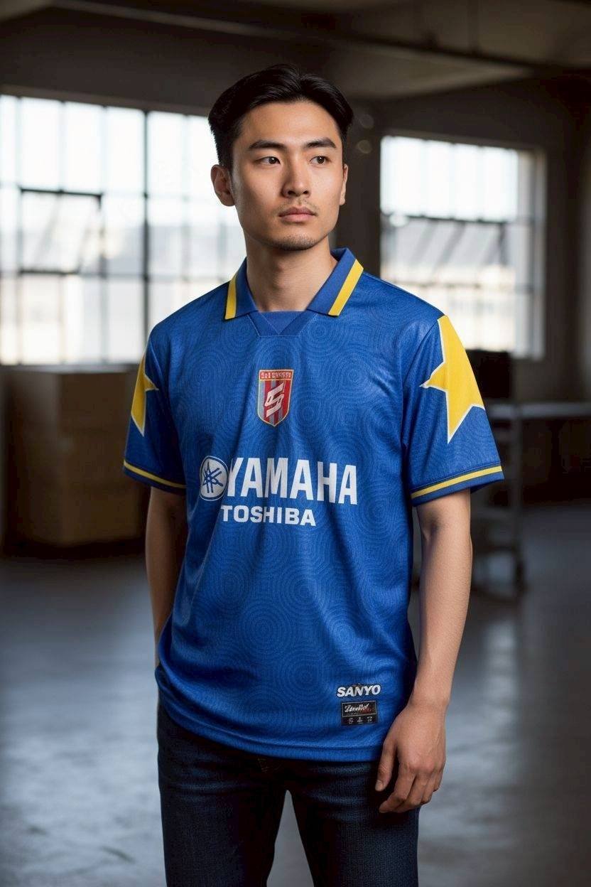 เสื้อฟุตบอลลายวงกลมวินเทจสีน้ำเงินเหลือง แบรนด์ YAMAHA TOSHIBA ผ้าโพลีเอสเตอร์ระบายอากาศ พิมพ์ซับลิเมชันคุณภาพสูง สีไม่หลุดไม่ลอก ใส่สบายทั้งเล่นกีฬาและใส่เที่ยว