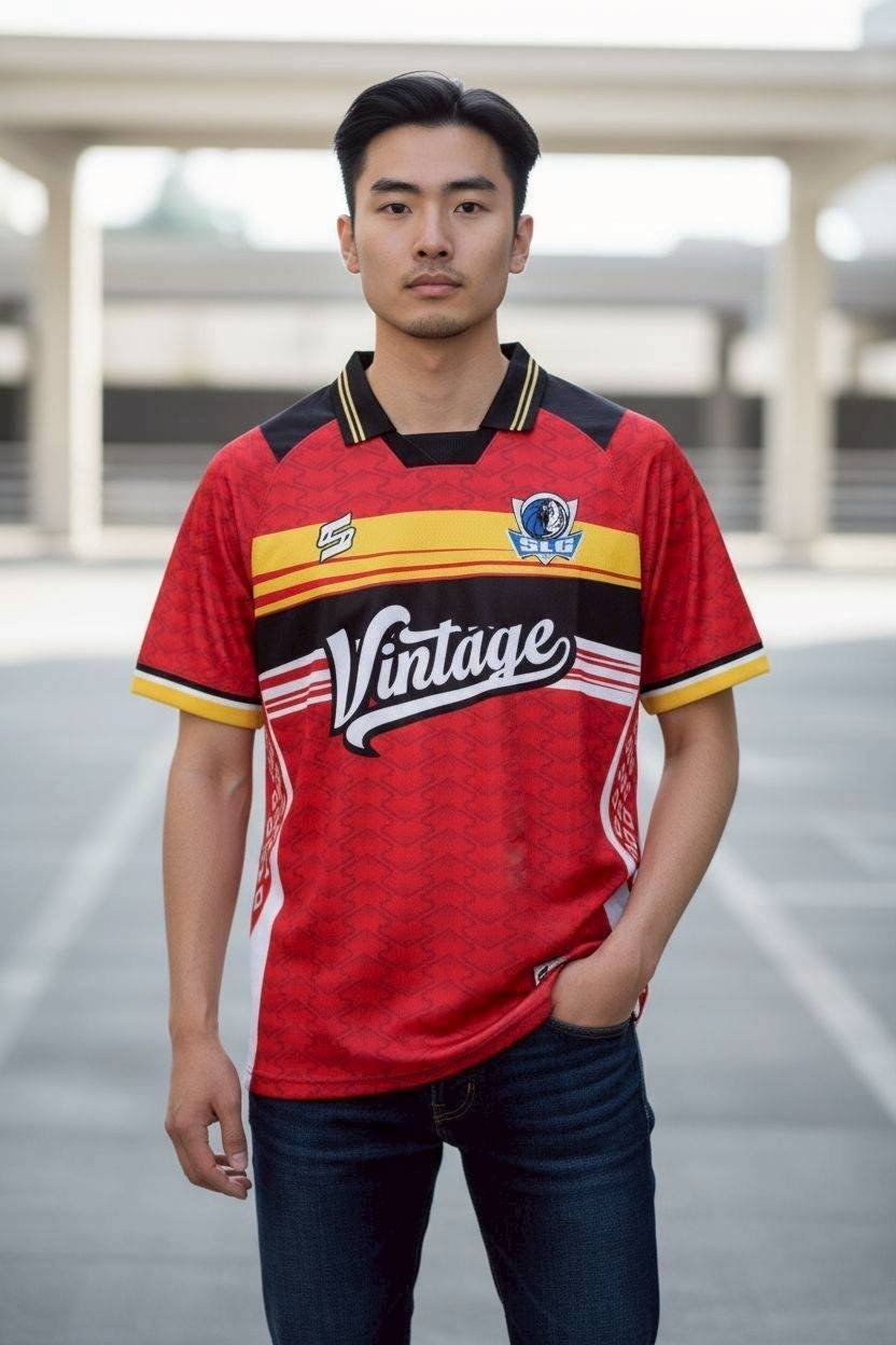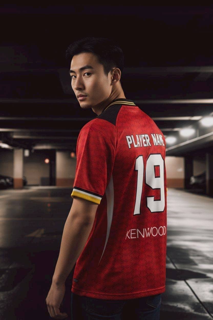เสื้อฟุตบอลดีไซน์สุดเท่ห์ในแนว Vintage ที่ผสมผสานความคลาสสิกเข้ากับความทันสมัย ด้วยโทนสีแดงและดำที่โดดเด่น ประดับลายเพชรพิเศษที่เพิ่มความหรูหราให้กับชุดแข่งขัน